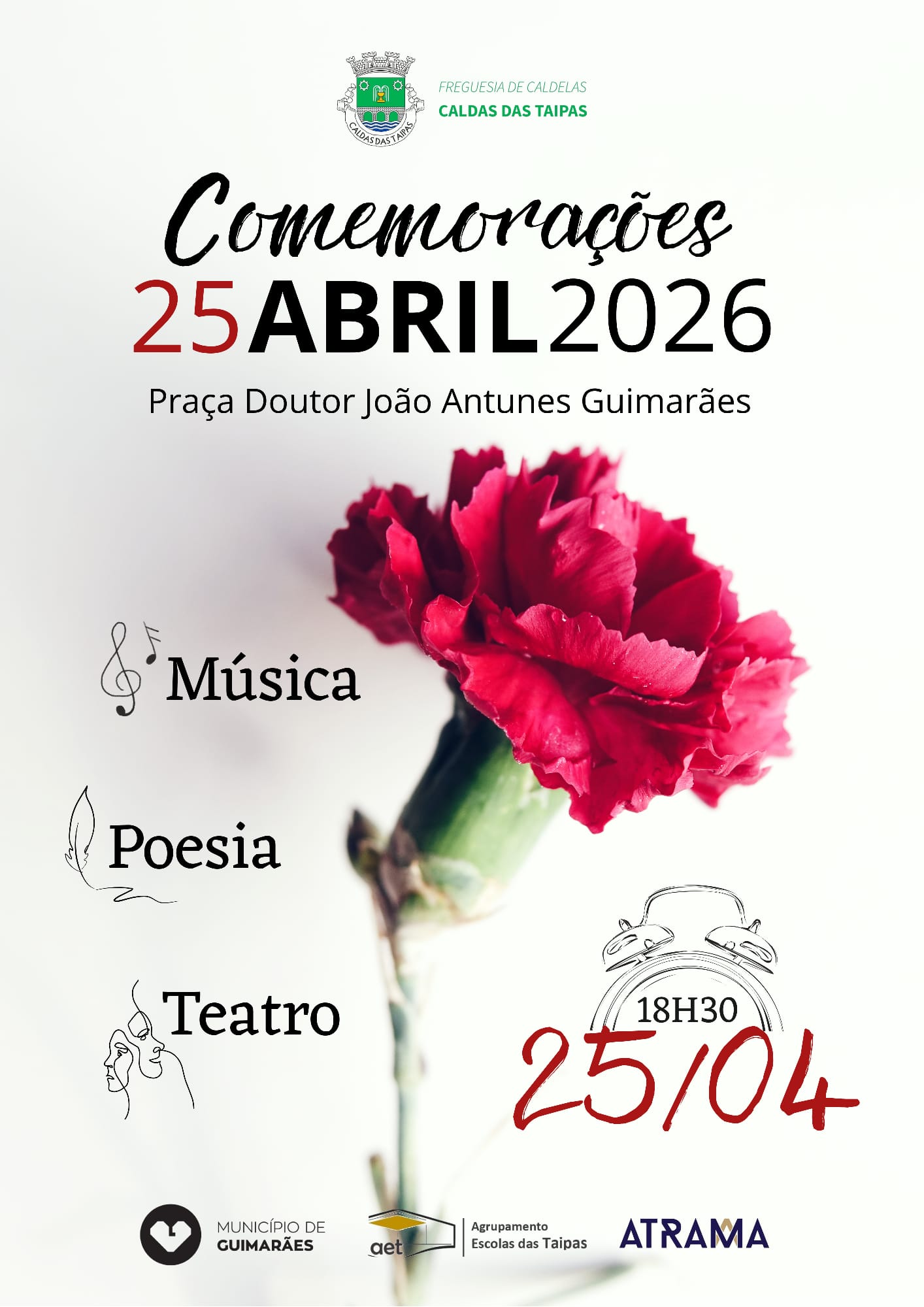 A partir das 18:30 horas, na Praça Doutor João Antunes Guimarães, serão interpretadas músicas de abril e declamados poemas, por alunos da Escola EB 2,3 de Caldas das Taipas. Também haverá lugar a uma pequena encenação teatral interpretada pela Companhia Atrama.