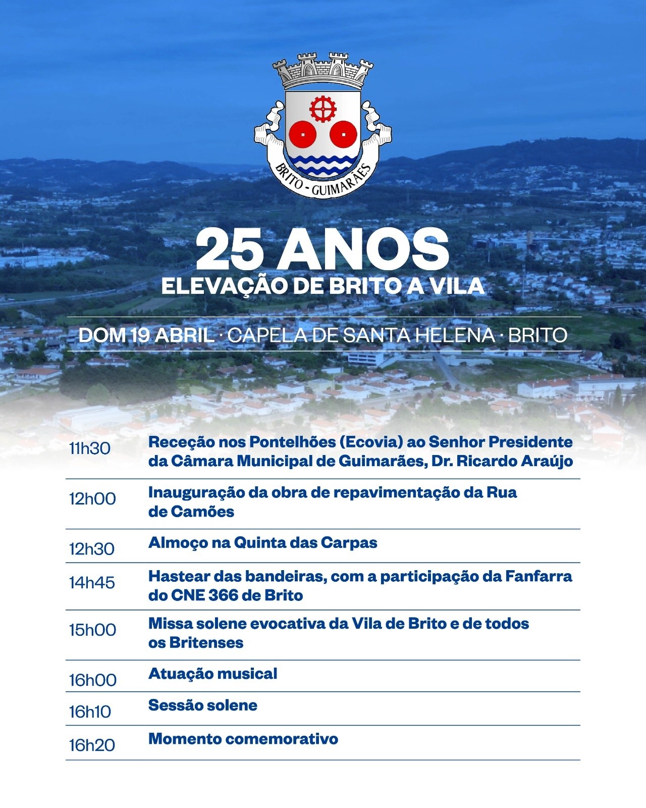 Este domingo, dia 19 de abril, Brito comemora um quarto de século desde que foi elevado a vila. Nesse âmbito, a respetiva Junta de Freguesia preparou um programa para as celebrações do marco, centradas na Capela de Santa Helena.