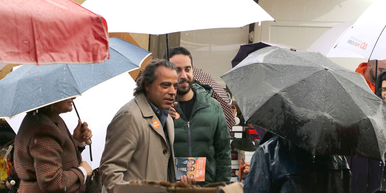 Debaixo de muita chuva, Ricardo Araújo e Emídio Guerreiro, ambos candidatos pelo círculo de Braga da AD – Coligação PSD/CDS às eleições legislativas que se realizam no próximo domingo, 18 de maio, visitaram na manhã desta segunda-feira a feira semanal das Taipas.