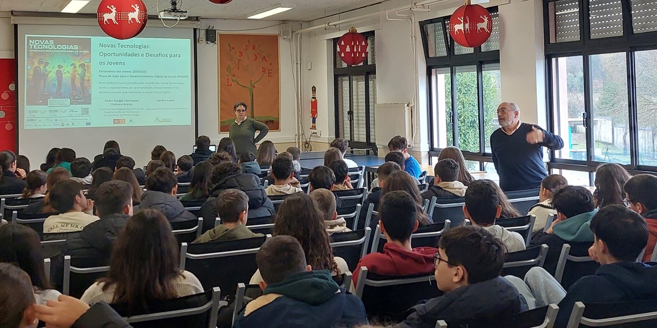 A iniciativa, que se realizou-se no final da manhã do passado dia 8 de janeiro, nas instalações da Escola Básica de Briteiros sob o tema central “Novas Tecnologias: Oportunidades e Desafios para os Jovens”, insere-se no projeto Parlamento dos Jovens 2024/2025 e no Plano de Ação para o Desenvolvimento Digital da Escola (PADDE) e foi conduzida pelo Professor Doutor Pedro Rangel Henriques, docente do Departamento de Informática da Universidade do Minho.