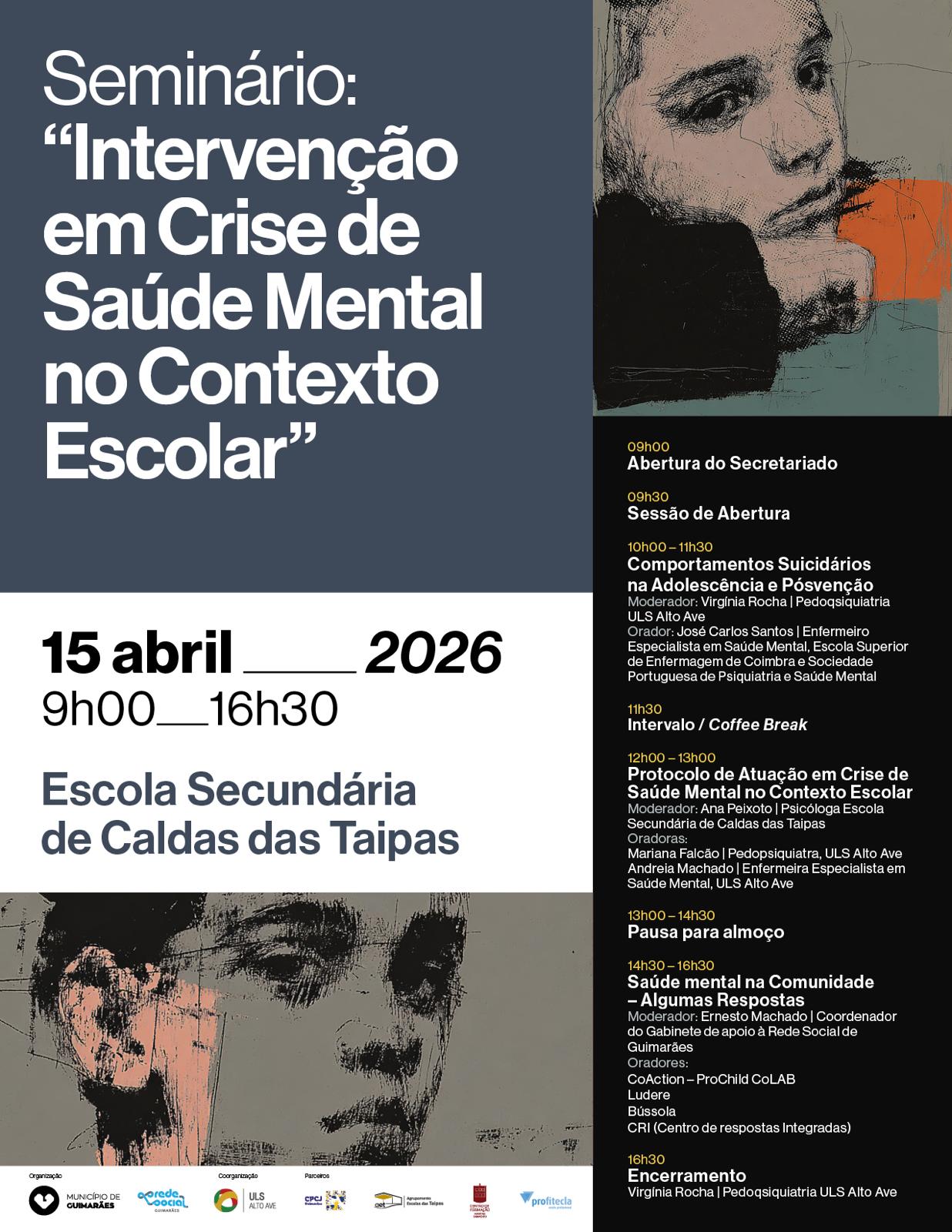 Organizado pelo Município de Guimarães e Rede Social, o seminário "Intervenção em Crise de Saúde Mental no Contexto Escolar" realiza-se na Escola Secundária de Caldas das Taipas, na próxima quarta-feira, dia 15 de abril, entre as 09h00 e as 16h30. Ao longo do dia, temas como a saúde mental e os comportamentos suicidários nos adolescentes serão o foco central das sessões.