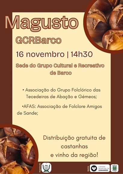 O Grupo Cultural e Recreativo de Barco (GCRBarco) realiza no domingo, dia 16 de novembro, o magusto, a partir das 14h30, nas instalações da associação. A iniciativa pretende celebrar a tradição outonal e promover o convívio entre a comunidade local.