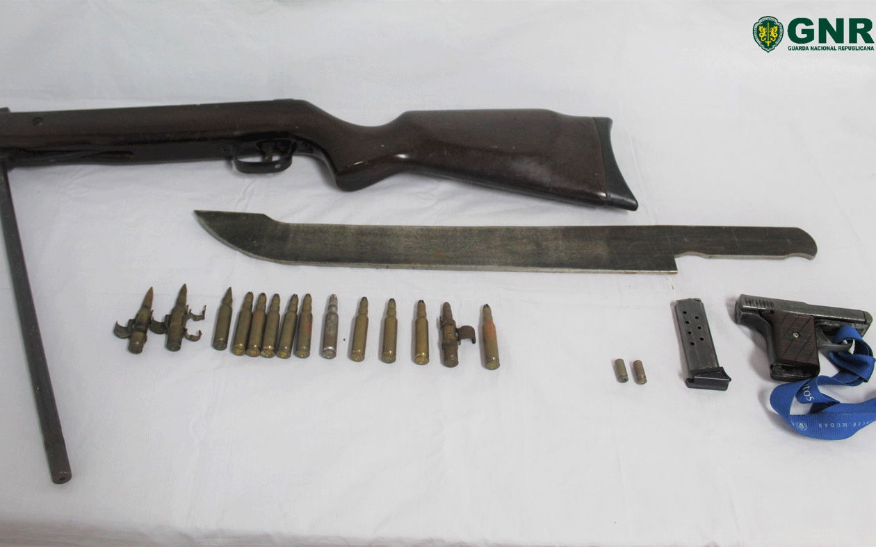 Dá conta a GNR das Taipas que foi apreendida uma pistola de calibre 6,35 mm, uma arma de pressão de ar de calibre 4,5 mm, uma catana, catorze munições de calibre 7,62 mm e ainda duas munições de calibre 8 mm.