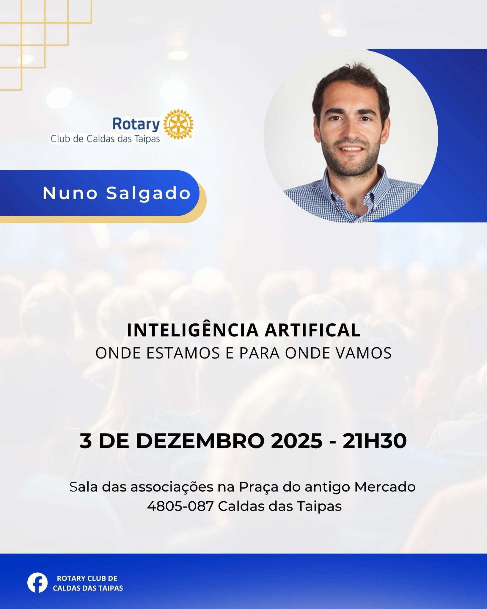 O Rotary Clube das Taipas lança o convite a toda a comunidade para participar na palestra subordinada ao tema “Inteligência Artificial – Onde Estamos e Para Onde Vamos”, a realizar na próxima 4ª feira, dia 3 de dezembro, a partira das 21h30, na Sala das Associações do antigo Mercado das Taipas.