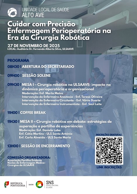 A Unidade Local de Saúde do Alto Ave (ULSAAVE) vai acolher, no dia 27 de novembro, o encontro "Cuidar com Precisão - Enfermagem Perioperatória na Era da Cirurgia Robótica", que decorrerá no auditório do Hospital da instituição.